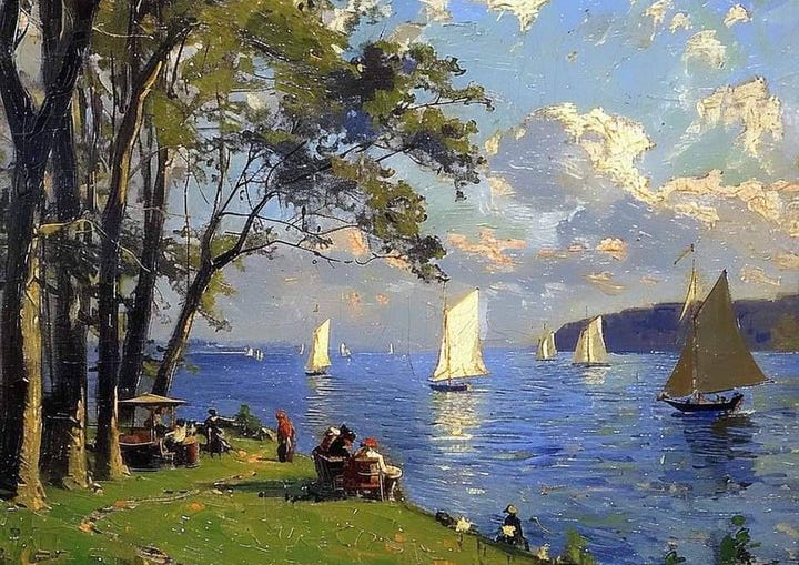 Paint billowing clouds soft as the down pillow where I lay my head when I want to dream of summer days gone by. Lay them over a cerulean sky with the sun playing hide- and-seek between the clouds. Design a lake of Prussian blue windswept by gentle breezes. Create a sleek-hulled sailboat with a mahogany deck, its sails luffing in sight of the gusts ahead, waves lapping at her bow teasing her to heel. Let your words be the paint mixed with metaphor, painted on paper ringing loud and clear of a time long forgotten when the wind and waves sang their song of carefree hours spent tacking along the shoreline. Paint me a picture with words, oh bard.